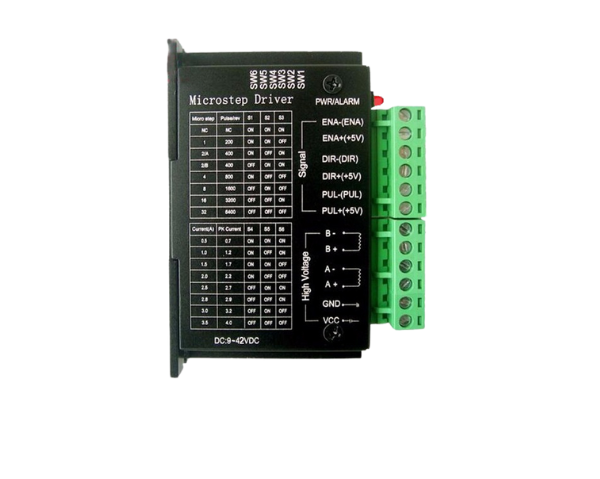 The TB6600 Stepper Motor Driver is a professional two-phase stepper motor driver. It supports speed and direction control. You can set its micro step and output current with 6 DIP switches. There are 7 kinds of micro steps (1, 2 / A, 2 / B, 4, 8, 16) and 8 kinds of current control (0.5A, 1A, 1.5A, 2A, 2.5A, 2.8A, 3.0A, 3.5A) in all. All signal terminals adopt high-speed optocoupler isolation, enhancing its anti-high-frequency interference ability.
